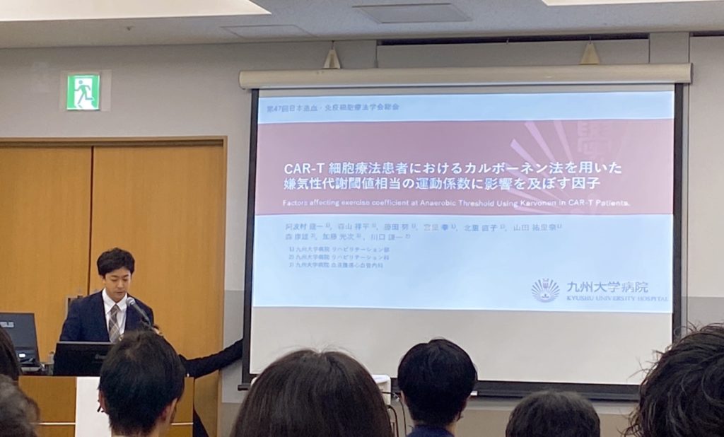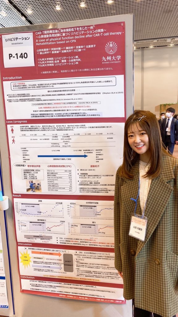 山田 理学療法士は『CAR-T細胞療法後に身体機能低下を生じた一例 ~心肺運動負荷試験に基づくリハビリテーションの実践~』という演題を発表し、他施設との議論を通して、積極的な意見交換が行われました。