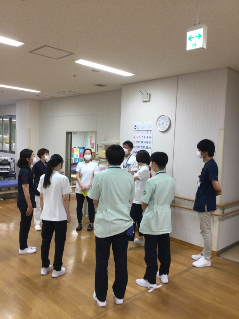 医療安全チームメンバーを中心に各チームでリハビリ時に患者さんに急変が起こった場面を想定して、シミュレーションを行い、各自で評価・フィードバックを行いました。