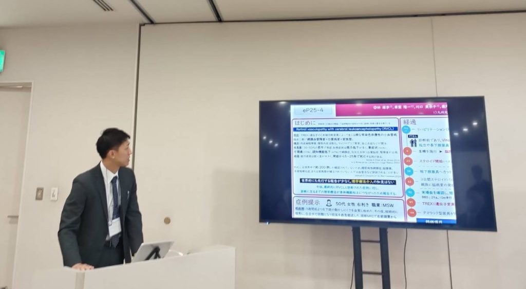 演題は「Retinal vasculopathy with cerebral leukoencephalopathy(RVCL)と診断された症例に対する理学療法経験」であり、希少疾患に対する理学療法介入の知見を報告いたしました。