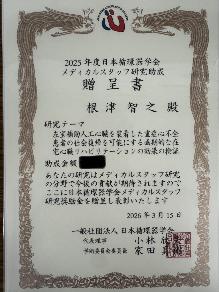 この度、理学療法士の根津が『2025年度日本循環器学会 メディカルスタッフ研究助成』に採択されました。